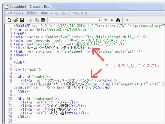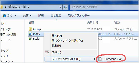index.htmlの上でマウスを右クリック→「プログラムから開く」→ Crescent Eveを選択